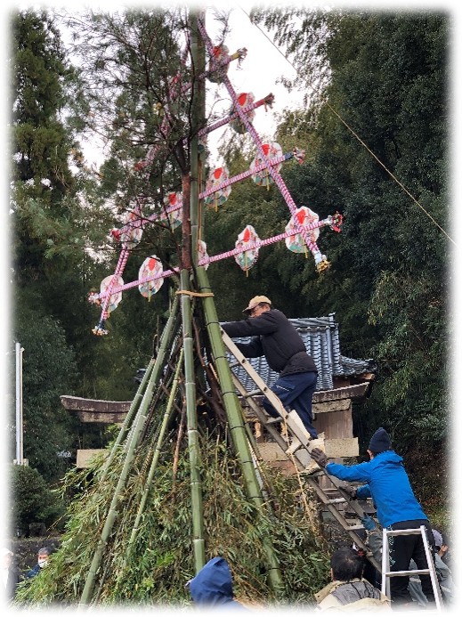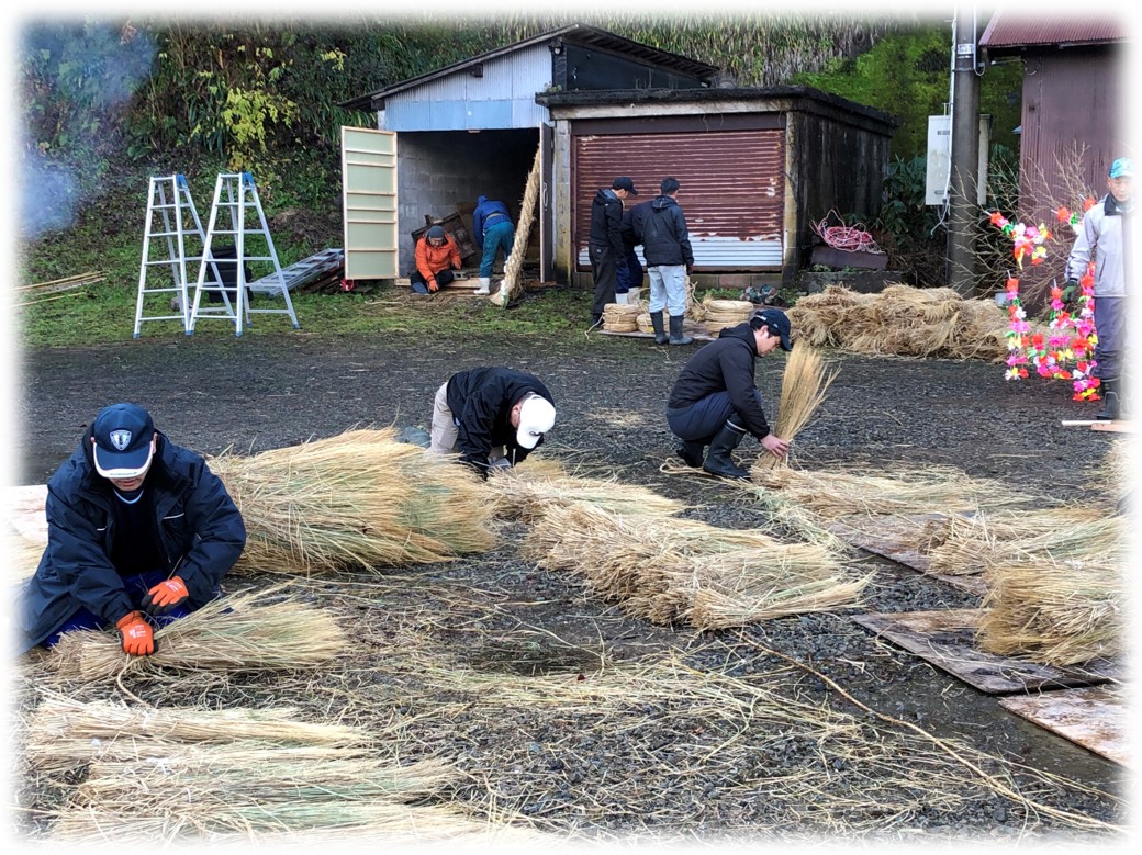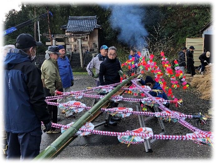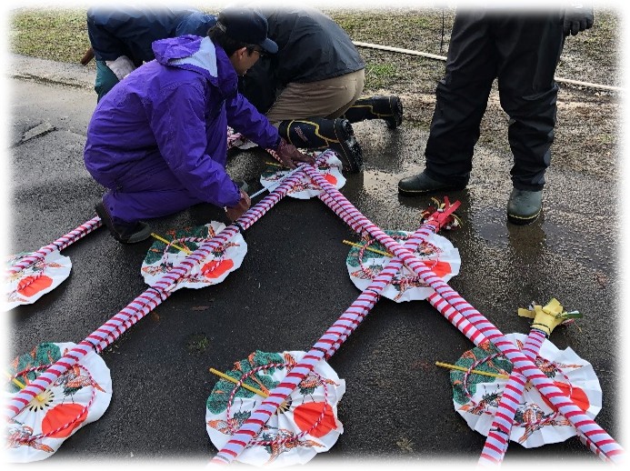 並行して、年末に老人会が中心となって作った飾りを組み立てて、竹に挟み込みます。