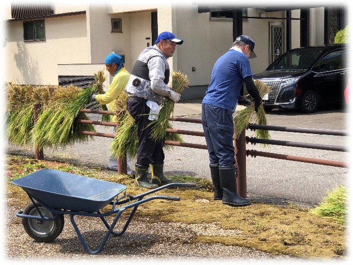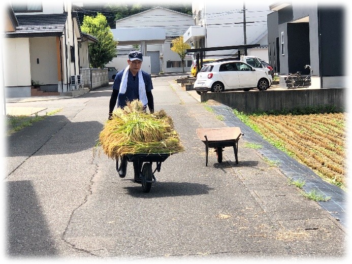 脱穀した稲わらは、また、一輪車の積んで道沿いのガードレールまで運んでから稲架掛けして、数日間をかけて乾燥します。