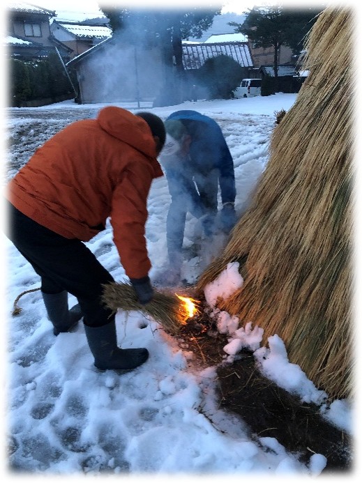 点火時刻の午前7時になったので、火を付けた藁を持って、左義長に設置した荒縄で作った導火線の近くに点火しました。