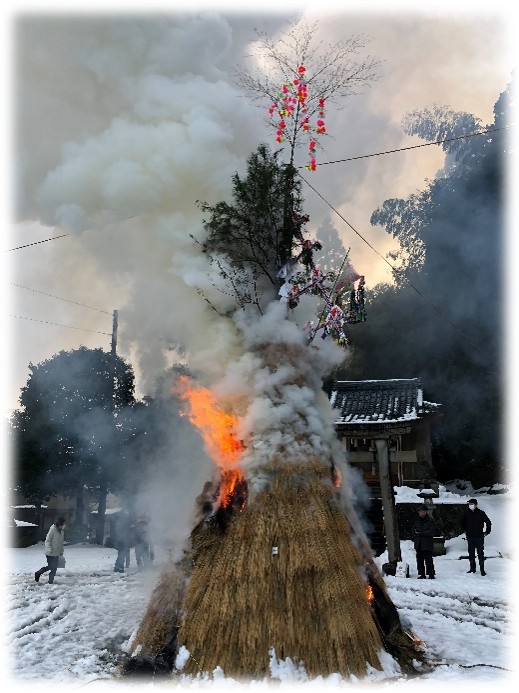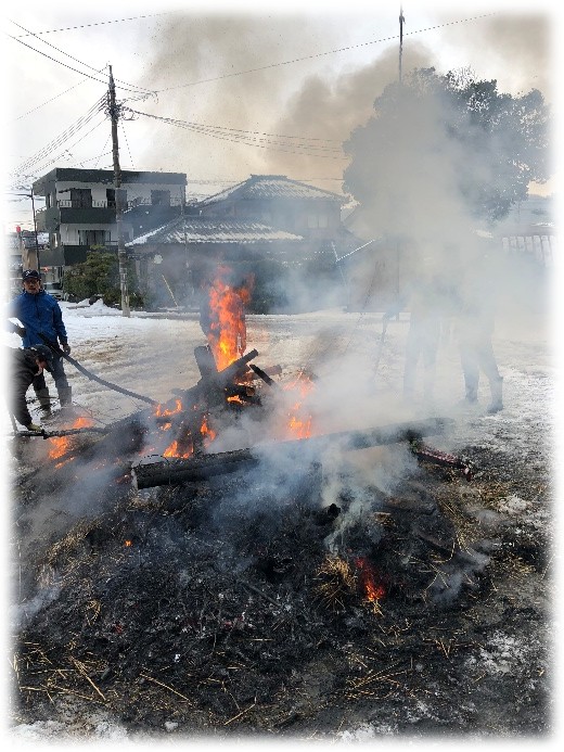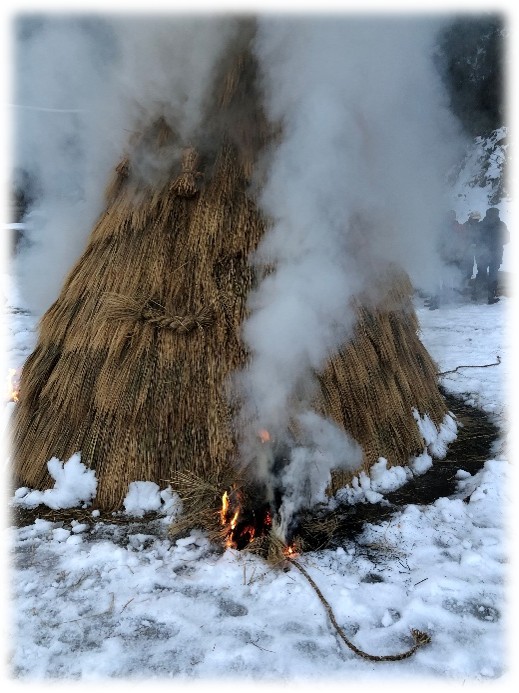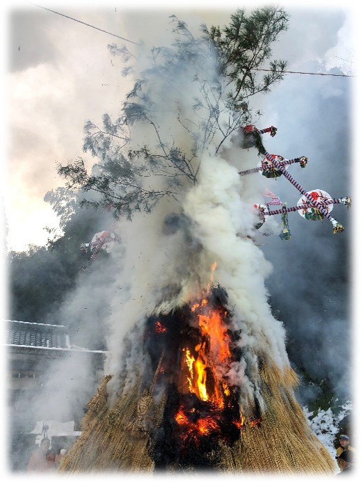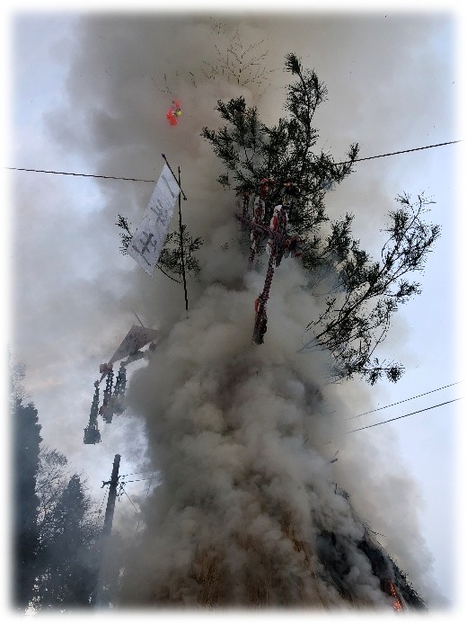 いよいよ、クライマックスです。左義長全体を包み込んだ炎は、昇龍のごとく天高く舞い上がり、私たちの願いとともに天に登って行きました。皆さんに幸多いことを願います。