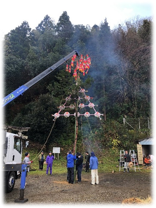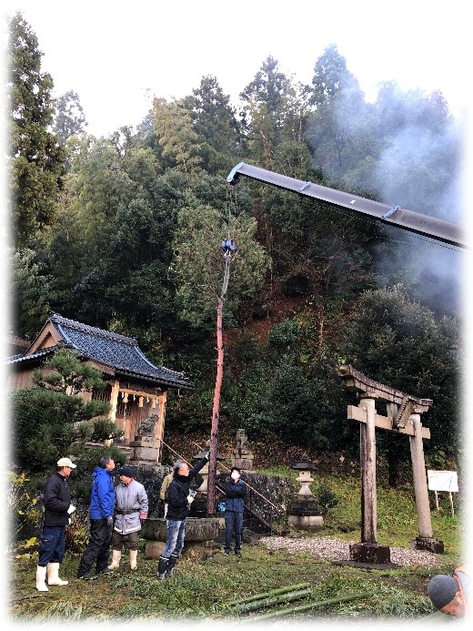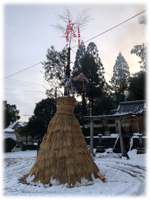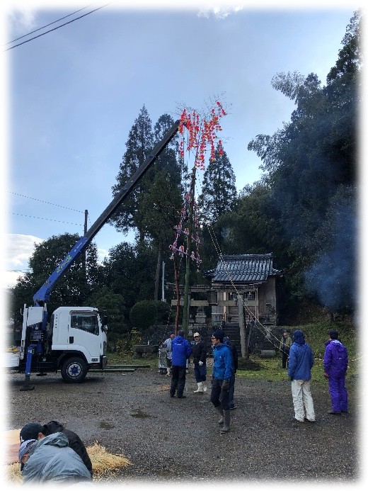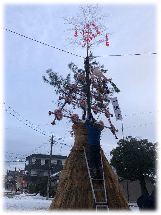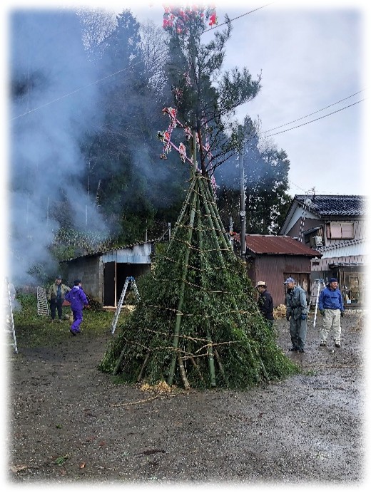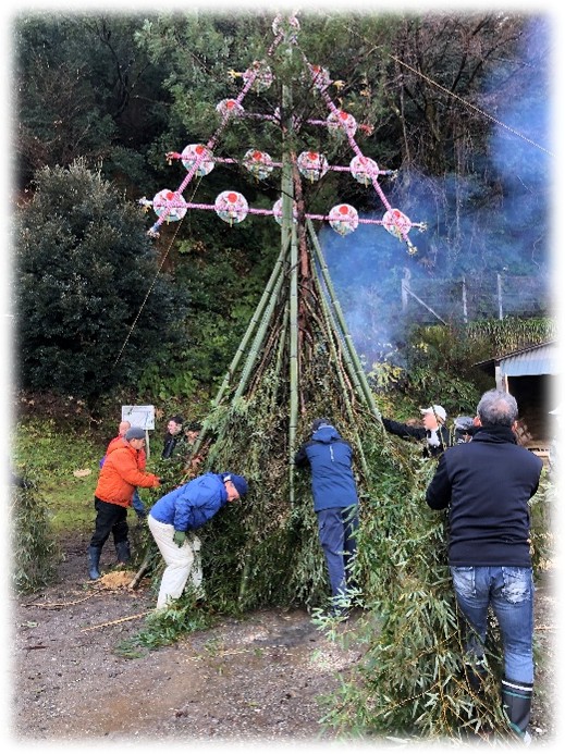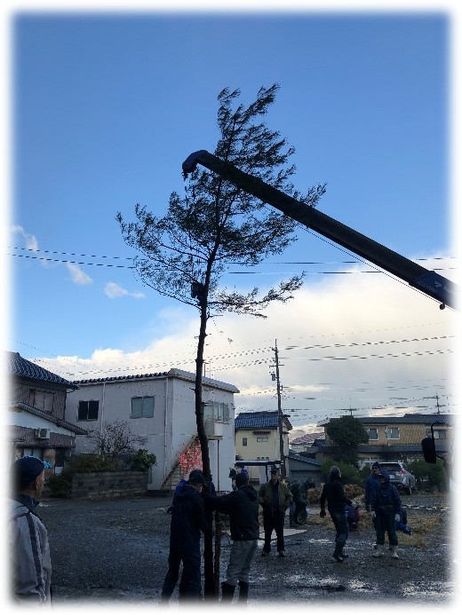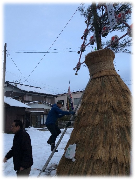 年末に山から伐り出した松の木を立てて、それに添わせて飾りを挟んだ竹を立てます。いつも関野運輸には感謝・・・