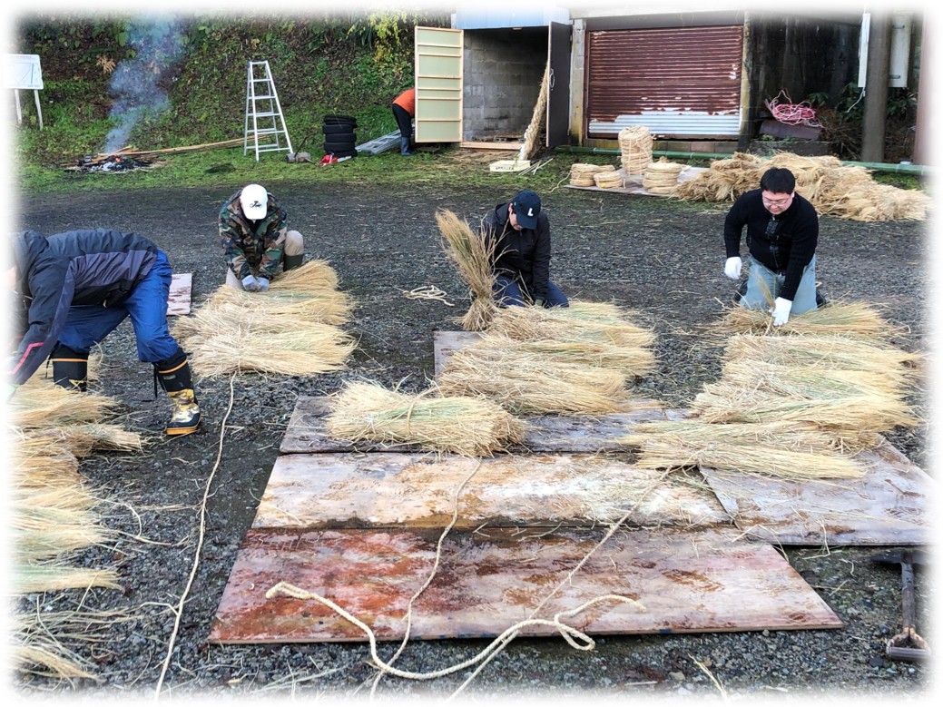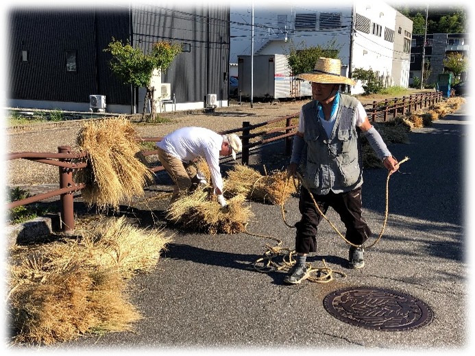 刈り取った稲わらを使って、左義長の胴体の周りに巻く「ぬま」を編んでいきます。