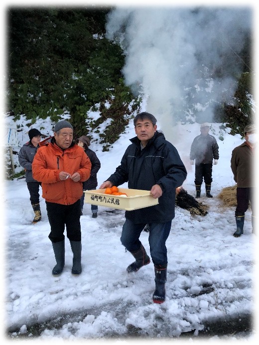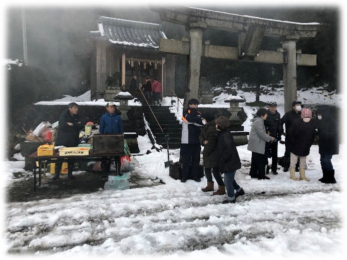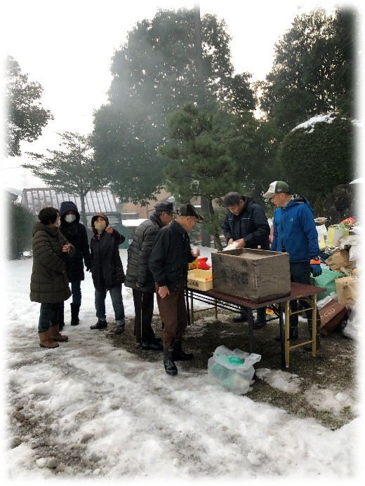 左義長や福町足羽神社への参拝者には、燃やす前に左義長にお供えしたお神酒や、するめ、みかんを振舞いました。三上さん!雪の中、大変ご苦労様です・・・