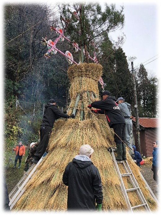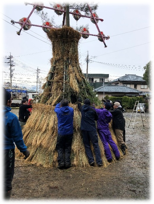 最後は「ぬま」を数人がかりで巻き、胴体に荒縄で固定した後、西南西の方向に向けて御幣を取り付けて完成です。