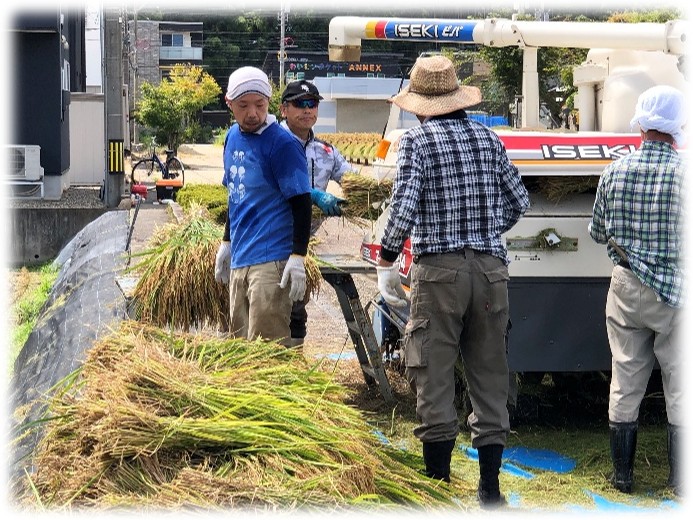 運んできた稲を、一束ずつコンバインに入れてカッターで裁断しないように脱穀します。自分の指も裁断しないように・・・